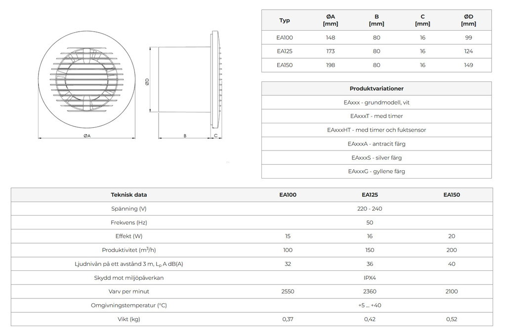 Fläkten är utrustad med fuktstyrning som automatiskt startar ventilationen när luftfuktigheten stiger, vilket hjälper till att minska risken för fuktproblem och förbättrar inomhusklimatet. Den har kapslingsklass IPX4 och isoleringsklass B, vilket gör den lämplig för fuktiga utrymmen. Hölje och front är tillverkade i tålig ABS-plast som är motståndskraftig mot värme och UV-strålning. Motorn är även utrustad med överhettningsskydd för ökad säkerhet och lång livslängd.