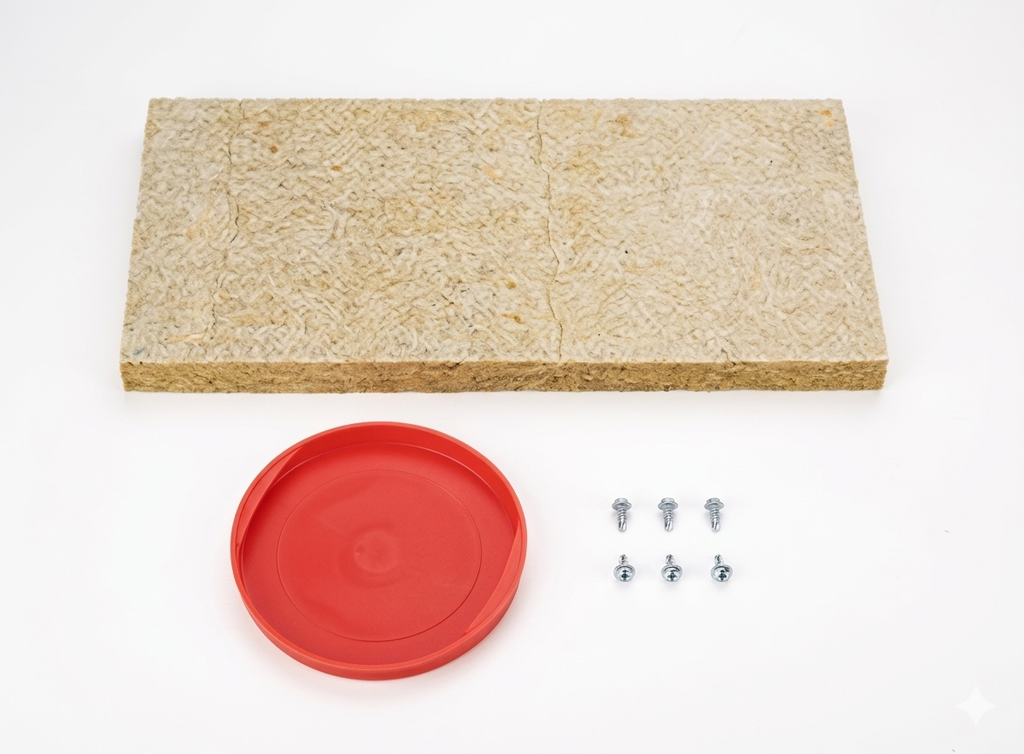 - Isoleringsplatta: En mineralullsbaserad platta som förhindrar värmeförlust och dämpar ljud.