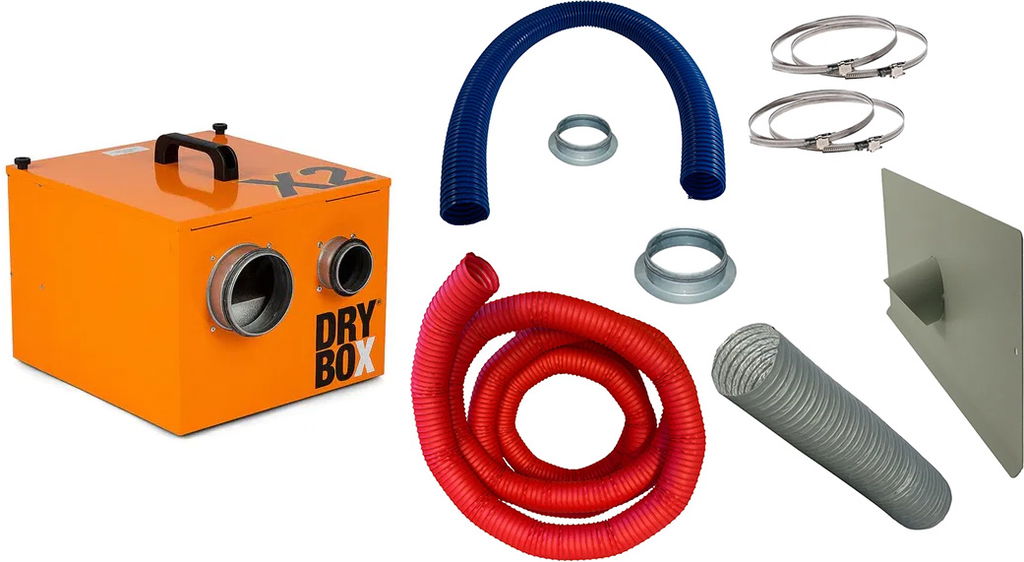Krypgrundavfuktare Drybox X2 tillsammans med tillbehörspaket för krypgrundsinstallation.