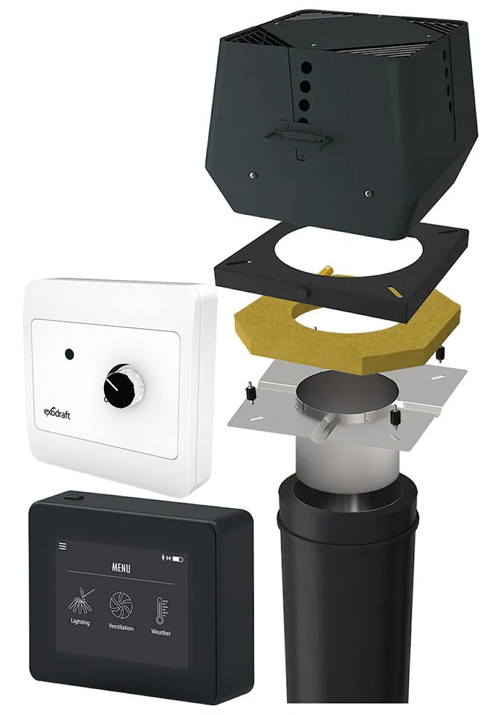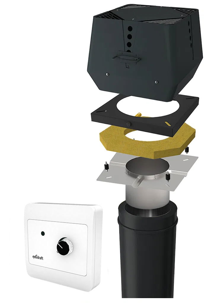 Komplett paket från Exodraft, paket som är RSV 12 rökgasfläkt och passar till modulskorsten samt öppen eldstad. Inklusive styrning och tillbehör.