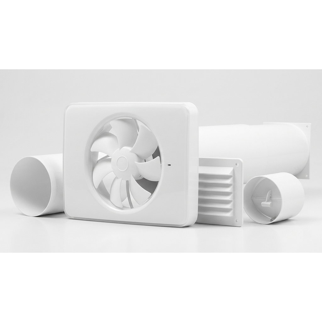 Här är ett färdigt paket bestående av badrumsfläkt Fresh Intellivent samt passande genomföringskit bestående av modulrör, kallrasskydd och utvändigt galler.