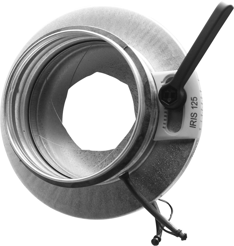 Irisspjäll 125 för mätning och injustering av luftflöden. Låg ljudnivå, centriskt flöde, fasta mätuttag som ger noggrann flödesmätning samt är utrustad med regleringsfunktion som kan öppnas helt, vilket betyder att det inte krävs någon renslucka.