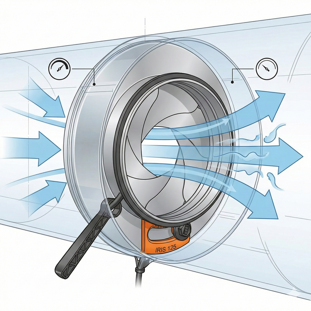Irisspjäll för mätning och injustering av luftflöden. Låg ljudnivå, centriskt flöde, fasta mätuttag som ger noggrann flödesmätning samt är utrustad med regleringsfunktion som kan öppnas helt, vilket betyder att det inte krävs någon renslucka.