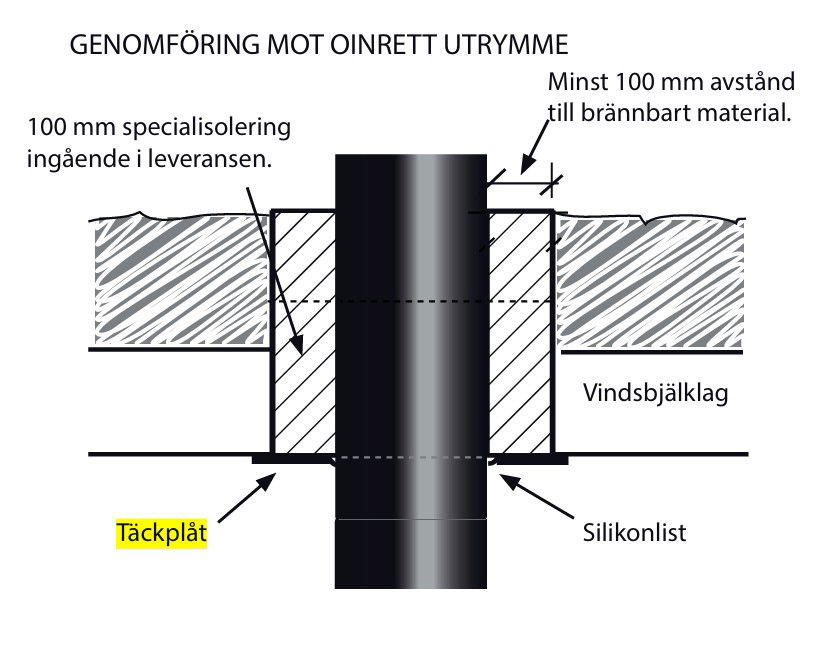 Efter att isoleringen monterats täcks genomföringen med en täckplåt, som både döljer håltagningen och fungerar som centrering samt stabilisering av skorstenen.