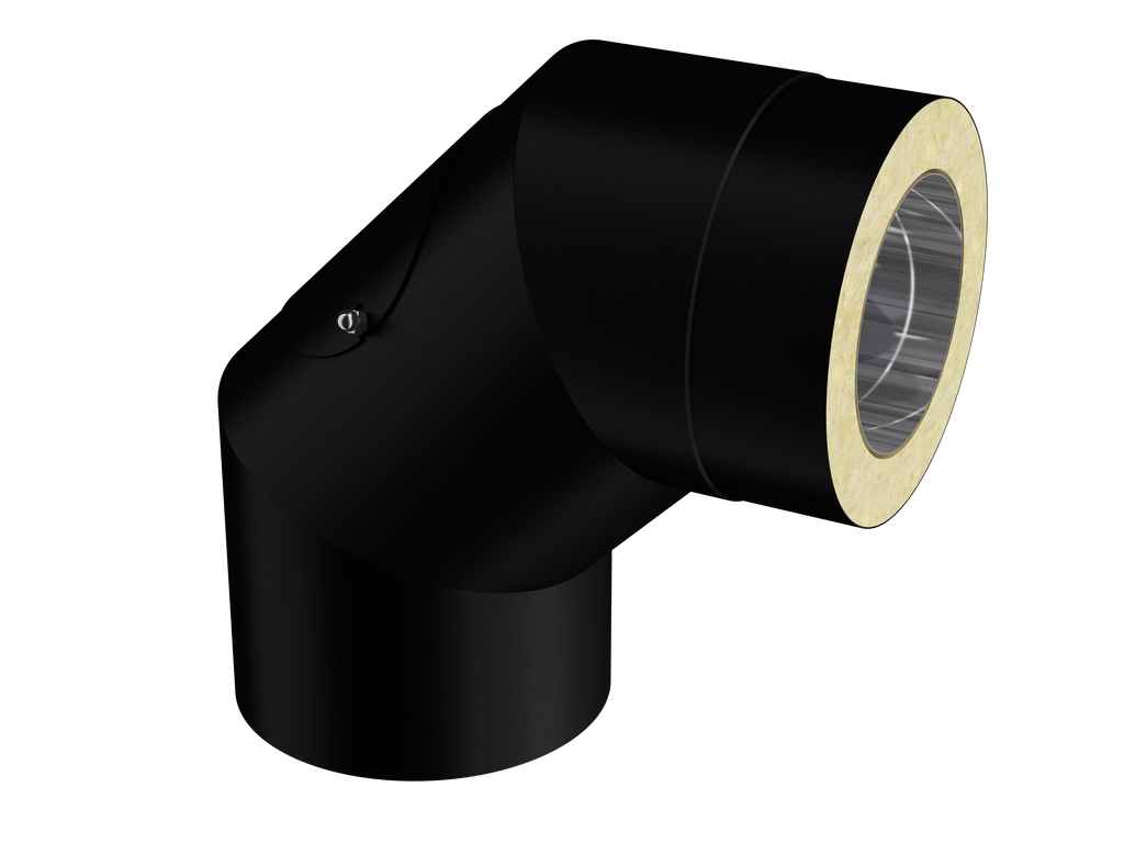 Elegant svart 90° skorstensböj med sotlucka för enkel rengöring och effektiv rökavledning och helisolerad med 32,5mm isolering.