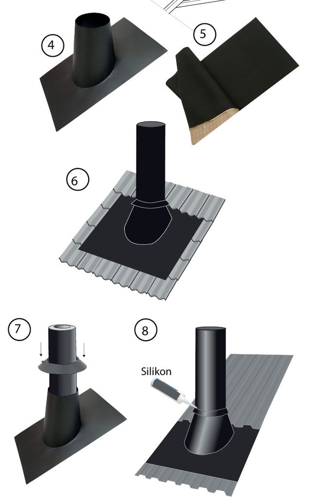 På ovansidan av konen runt skorstenen monteras regnkragen. Den trycks ned så tätt som möjligt mot konen och tätas mot yttermanteln med silikontätningsmassa. Detta förhindrar att vatten rinner längs skorstenen och in i byggnaden.