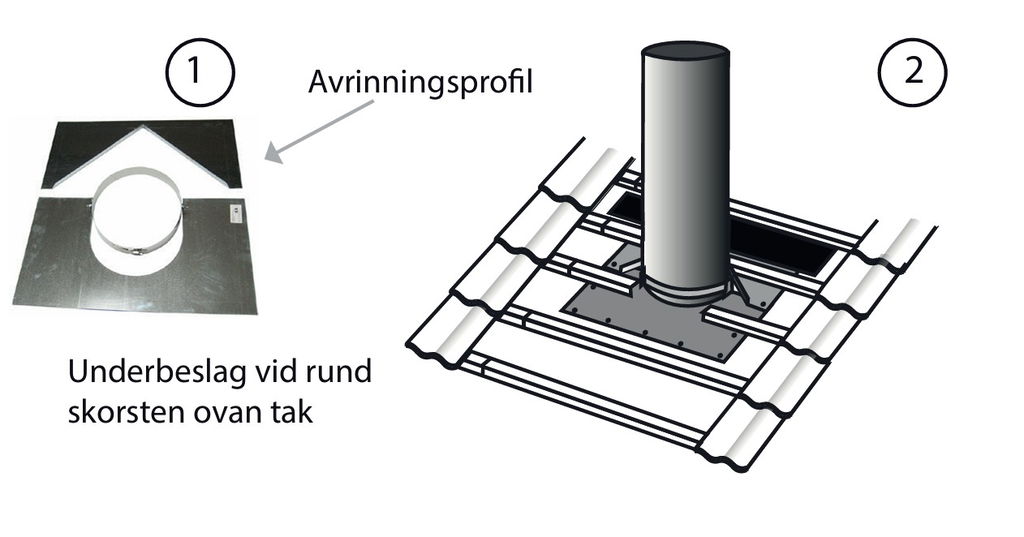Underbeslaget är tvådelat och ska placeras under takpappen. Det skruvas eller spikas fast i taket med avrinningsprofilen riktad mot nocken för att säkerställa korrekt avledning av vatten. Underbeslaget innehåller även en integrerad distansförankring som bidrar till att stabilisera skorstenen vid genomföringen.