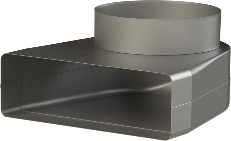 QuadroDEC 220x55 Övergång 90° till cirkulärt 125. Övergång till vanliga runda kanaler i dimension 125. Tillverkade av varmförzinkad stålplåt med minsta zinklagertjocklek 275 g/m² för lång hållbarhet.