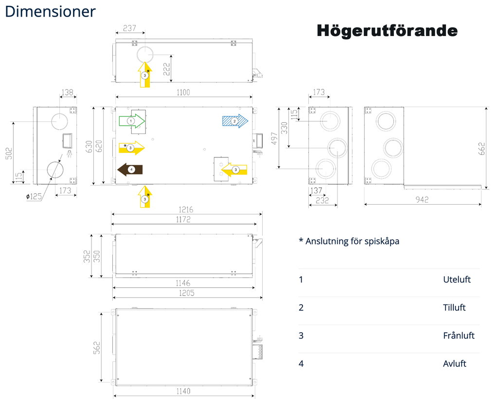 - Bypass för spiskåpa: Utrustad med en separat bypass-kanal för spiskåpsanslutning. Matos leds förbi värmeväxlaren för att undvika nedsmutsning (grundventilation genom kåpan är ej möjlig).