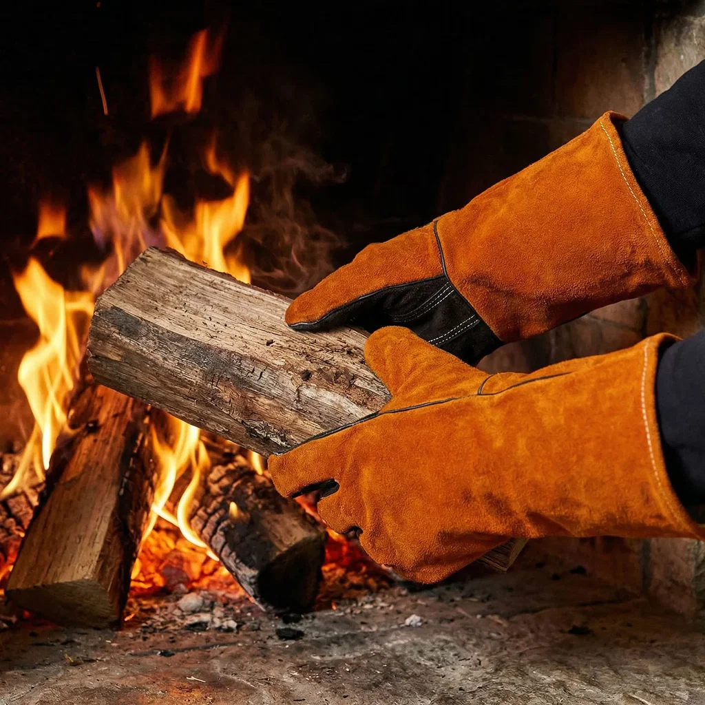 Värmebeständiga Läderhandskar – Skydd för Kamin, Grill och Eld